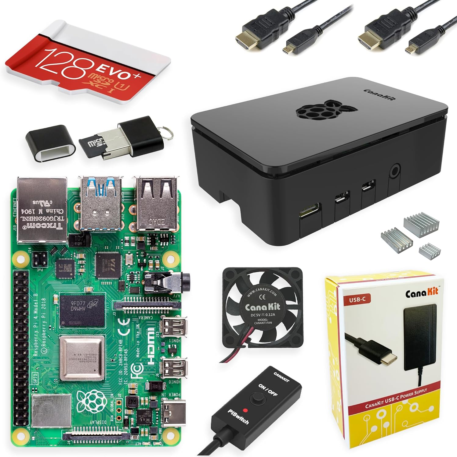 - CanaKit 3.5A USB-C Raspberry Pi 4 Power Supply with Noise Filter, Set of Heat Sinks, Set of 2 Micro HDMI to HDMI Cables – 6 foot (Supports up to 4K 60p)